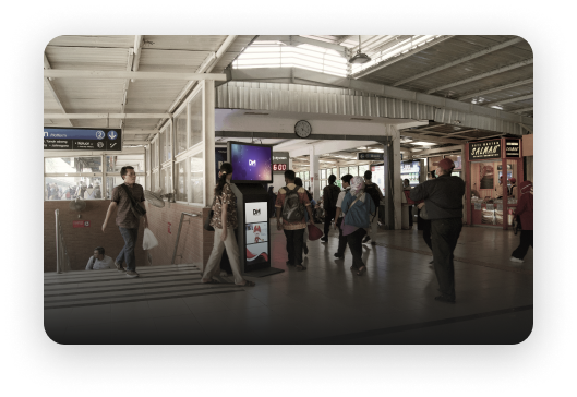 Sebagai salah satu tempat teramai dengan lebih dari 2 juta orang yang melakukan perjalanan setiap hari, DIM adalah satu-satunya media yang menjangkau stasiun lokal. Media kami mencakup 93 stasiun di wilayah JABOTABEK dan Surabaya. Kami akan membantu Anda menjangkau lebih banyak penonton. Selanjutnya, DIM akan memperluas jangkauan media kami.